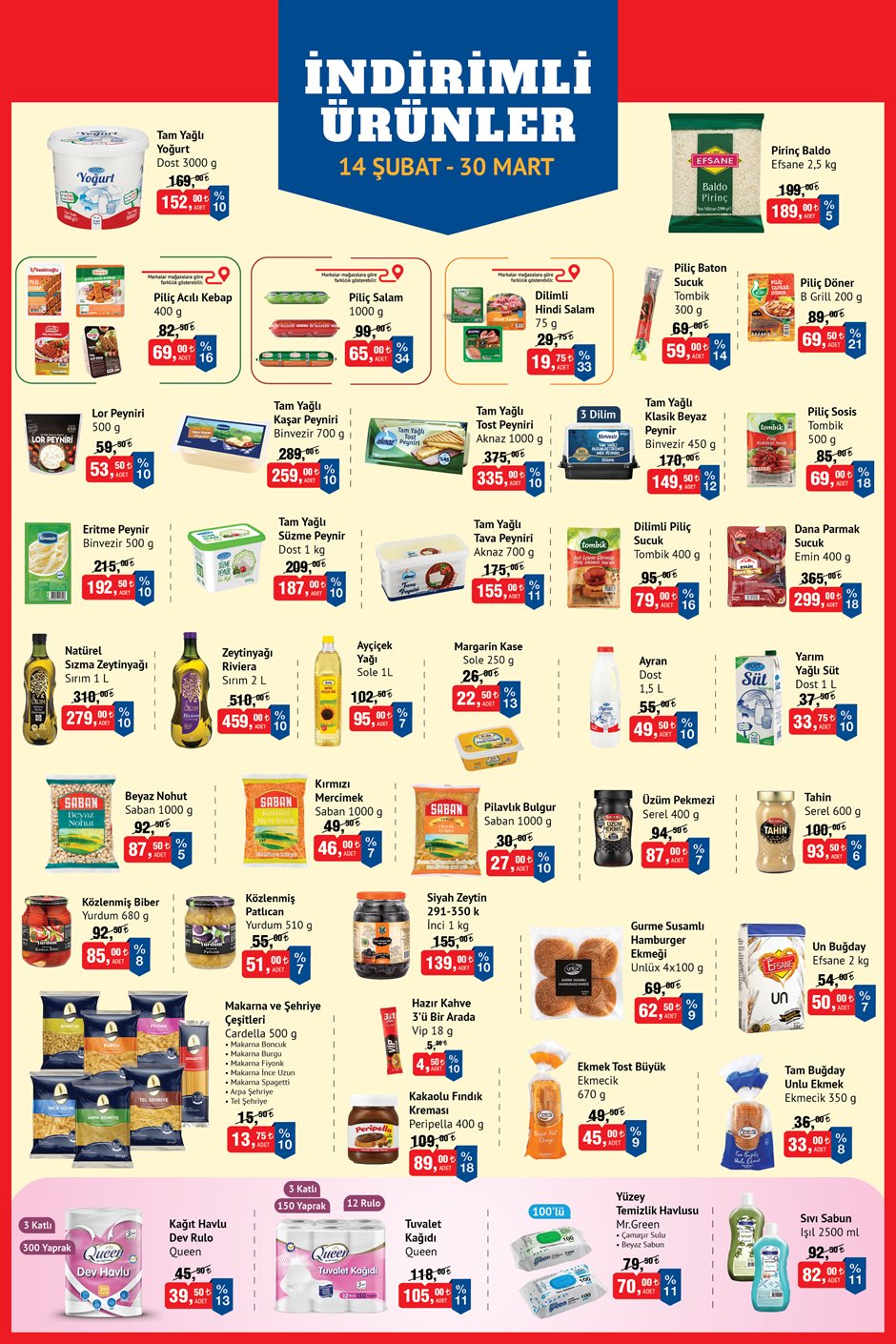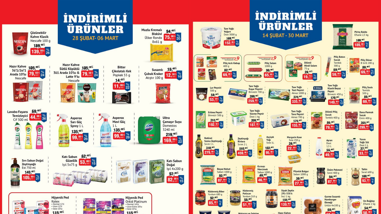 Yeni indirim kampanyasını duyuran BİM, 6 Mart’a kadar hijyenik petlerin yüzde 40 indirimli olarak satılacağını açıklarken bazı ürünlerin ise 30 Mart’a kadar uygun fiyatlarla tüketicilerin beğenisine sunulacağını duyurdu. Bu kapsamda, yeni aktüel kataloğunu da paylaşırken, gıdadan hijyenik ürünlere kadar pek çok farklı alanda indirim müjdesi verdi.